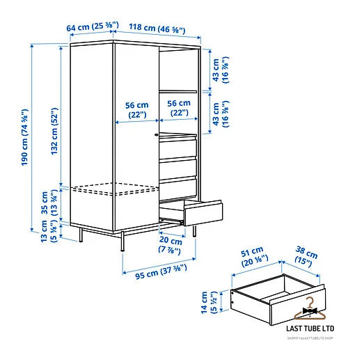 Comes with 4 drawers, 1 clothes rack, 1 shelf and 1 practical sliding door that saves floor space since it doesn't take up any space when opened. Perfect for a small bedroom or a narrow hallway.